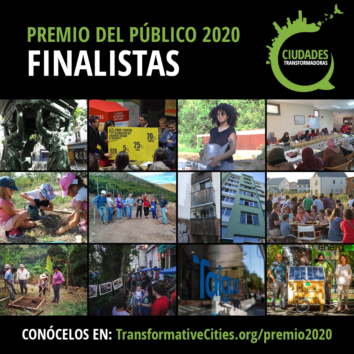 La iniciativa «Ciudades en transformación» busca dar visibilidad a las iniciativas y prácticas ciudadanas locales que actúan para la transformación de la sociedad en el ámbito de la alimentación, del agua, la vivienda o la energía. Este año se han seleccionado una docena de proyectos, incluyendo 2 en España y 2 en Latinoamérica. ¡Los votos están abiertos al público para elegir a los ganadores!